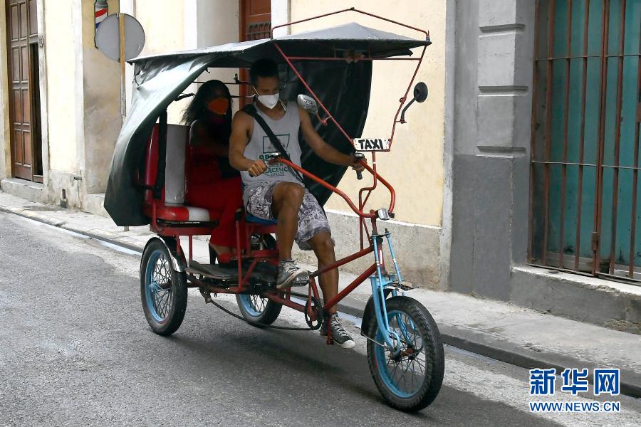 2月12日,在古巴哈瓦那,一名女子乘坐一辆私营三轮出租车出行。