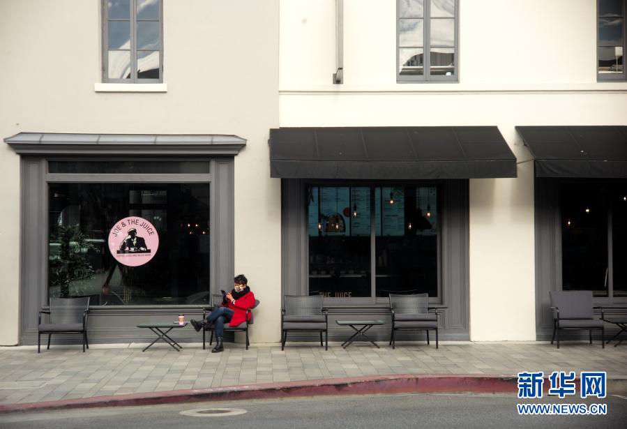 2月16日,一名女子在美国加利福尼亚州北部小城伯灵格姆的商业街喝咖啡。