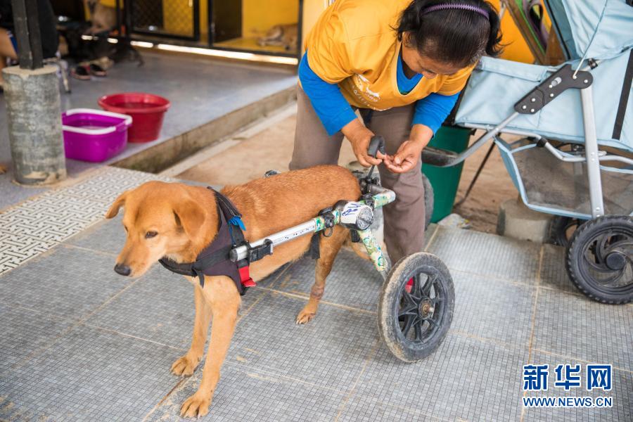2月16日,在泰国春武里府的“流浪狗救助者”收容所,工作人员为收容的残疾流浪狗戴上特制“轮椅”。