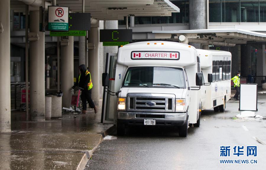 这是2月22日在加拿大多伦多皮尔逊国际机场拍摄的运送入境旅客到指定隔离酒店的班车。