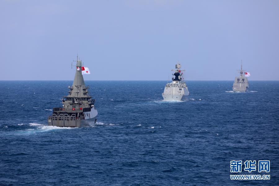 2月24日,在中国与新加坡海军的海上联合演习中,双方舰艇组成单纵队行进。
