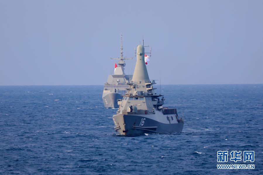 2月24日,新方“主权”号濒海任务舰(前)和“刚毅”号导弹护卫舰参加中国与新加坡海军的海上联合演习。