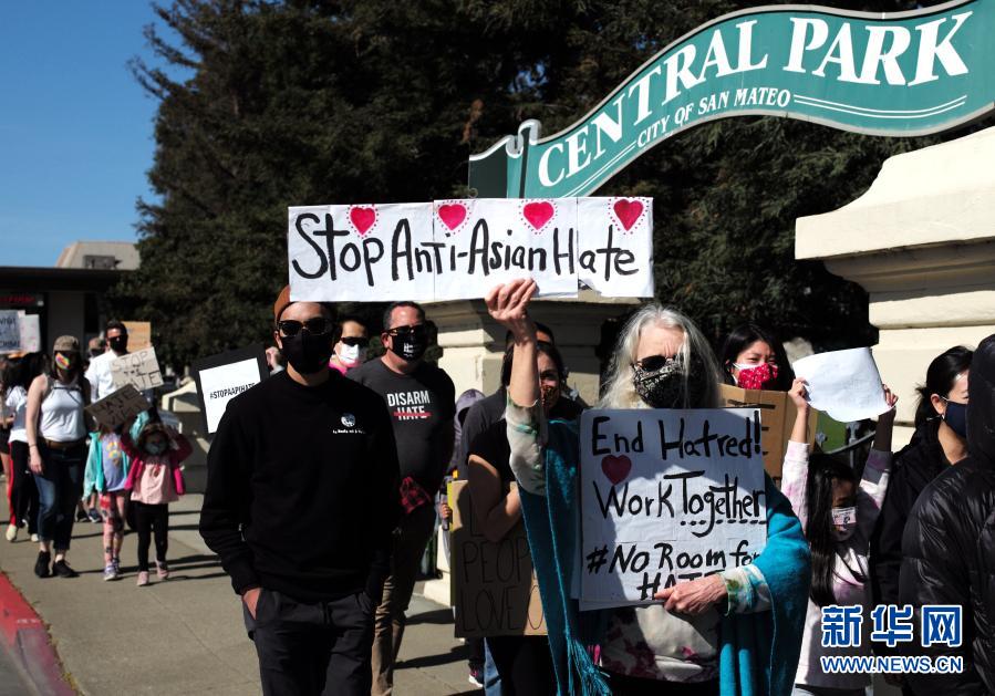 2月27日,在美国加利福尼亚州旧金山湾区圣马特奥市,人们参加集会反对针对亚裔的歧视行为和仇恨犯罪。