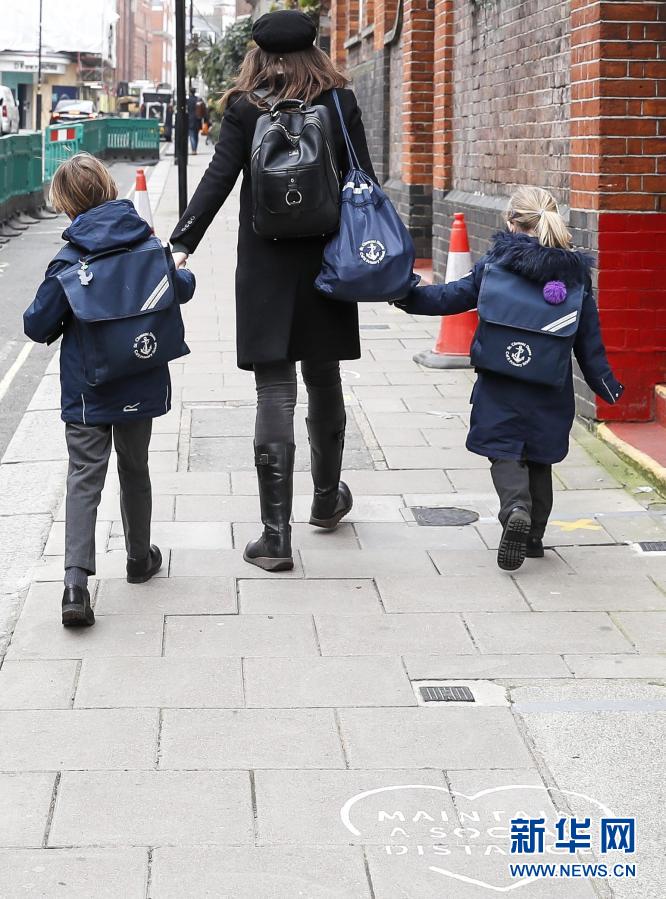 3月8日,英国伦敦一名女子送孩子上学时走过街道上提示保持社交距离的标识。新华社记者 韩岩 摄