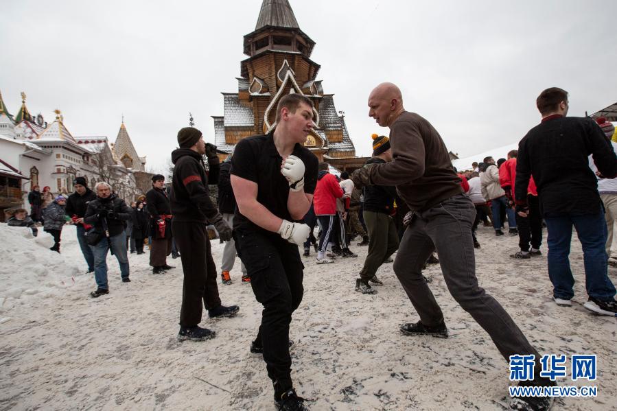 3月13日,在俄罗斯首都莫斯科,人们参加搏击活动庆祝谢肉节。