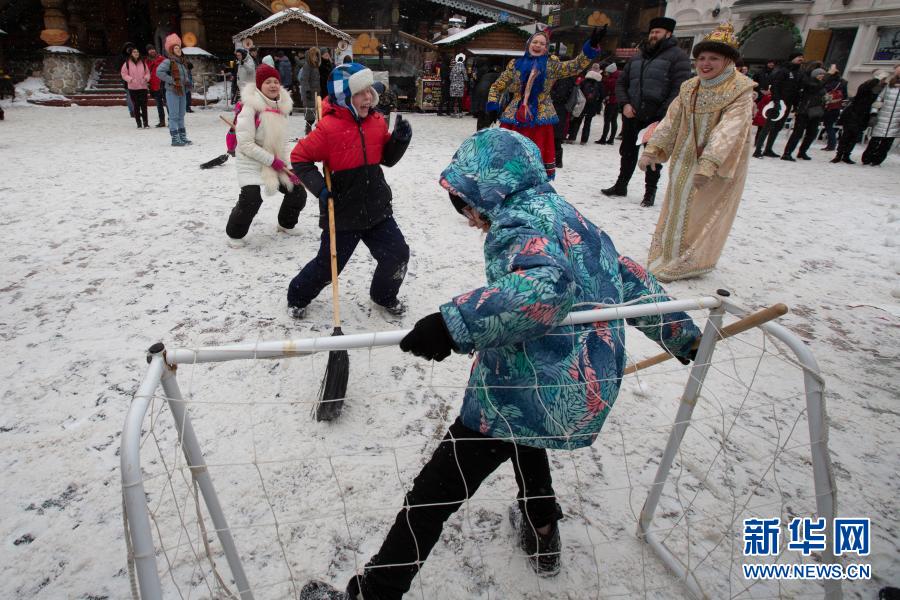3月13日,在俄罗斯首都莫斯科,人们参加游戏活动庆祝谢肉节。