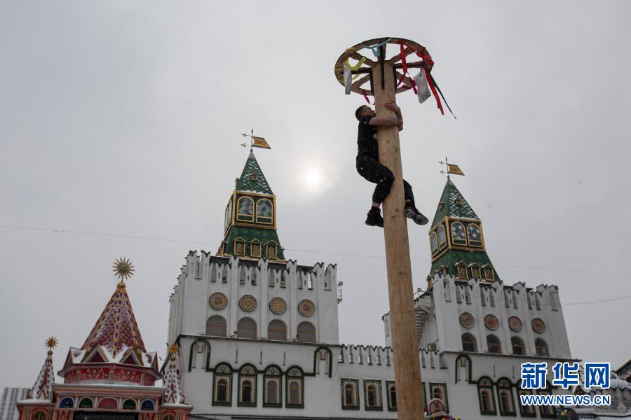 3月13日,在俄罗斯首都莫斯科,一名男子参加爬杆活动庆祝谢肉节。