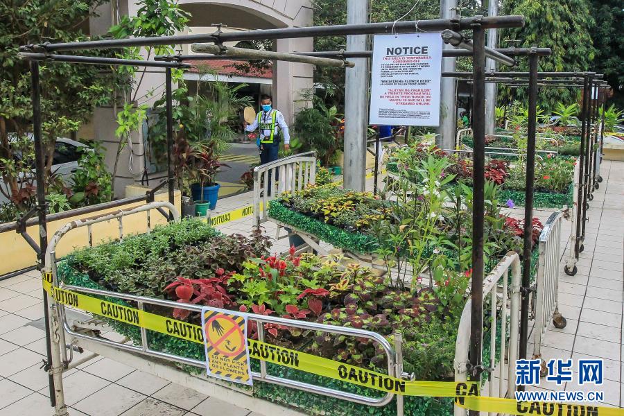 3月18日,在位于马尼拉的菲律宾大学附属菲律宾总医院,一名安保人员看向“低语的花床”艺术装置。