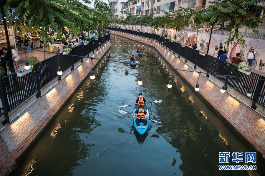 3月19日,游客在泰国曼谷翁昂步行街体验皮划艇漂流。