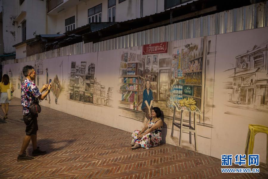 3月19日,游客在泰国曼谷翁昂步行街与涂鸦合影。新华社记者 张可任 摄