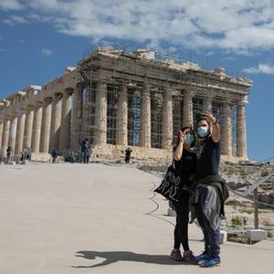 3月22日,游客游览希腊雅典卫城。希腊露天考古遗迹22日起恢复开放。游客需遵守保持社交距离和佩戴口罩等防疫规定。新华社发(莱夫特里斯·帕察里斯摄)