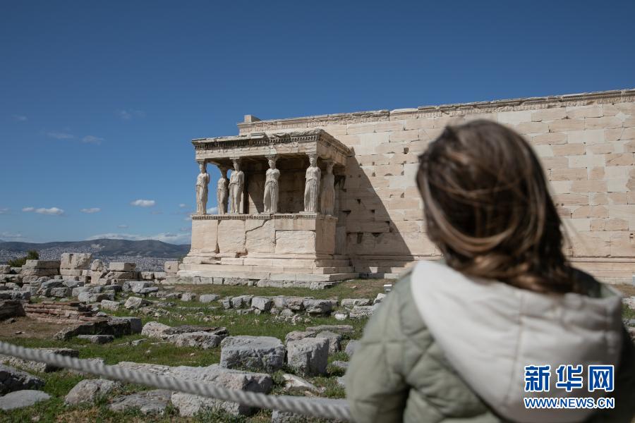 3月22日,一名游客游览希腊雅典卫城。希腊露天考古遗迹22日起恢复开放。游客需遵守保持社交距离和佩戴口罩等防疫规定。新华社发(莱夫特里斯·帕察里斯摄)