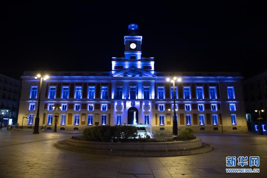这是3月27日晚拍摄的西班牙马德里太阳门广场。