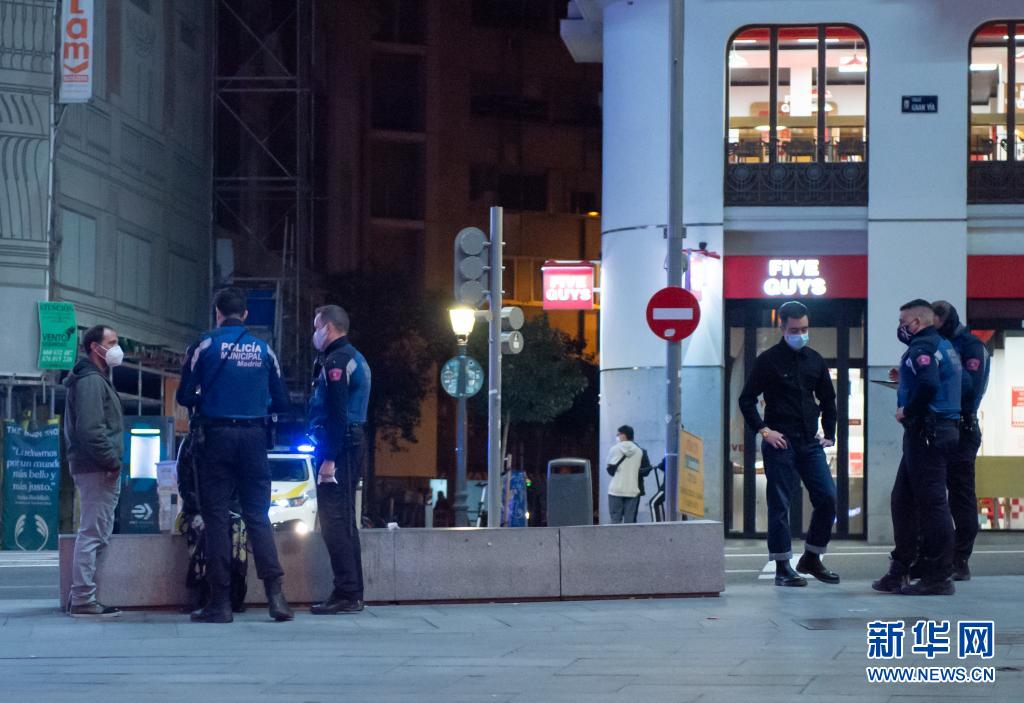 3月27日晚,警察在西班牙马德里市中心检查宵禁后仍在街上的人们的证件。