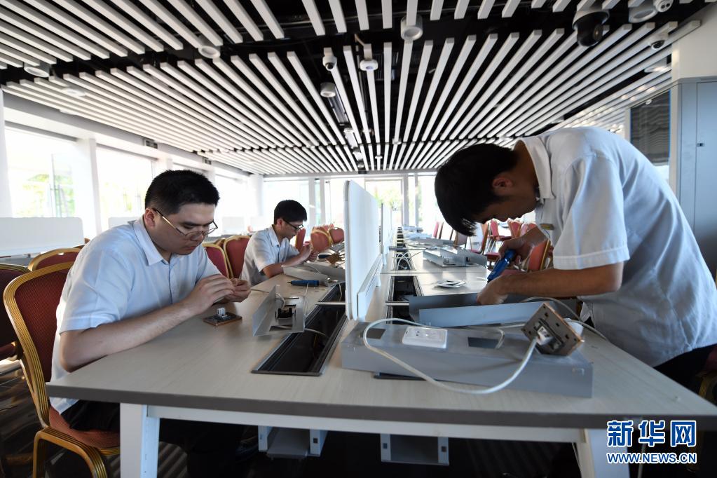 4月10日,工作人员在安装新闻中心网络设施。