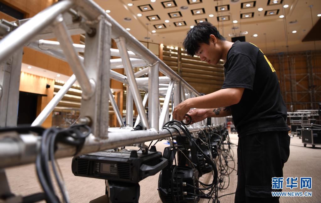 4月10日,工作人员在检查主会场灯光设备。