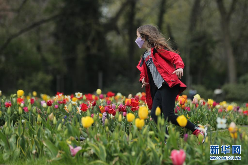 4月14日,一名小女孩在比利时布鲁塞尔以西的拜加登城堡的花丛中奔跑。