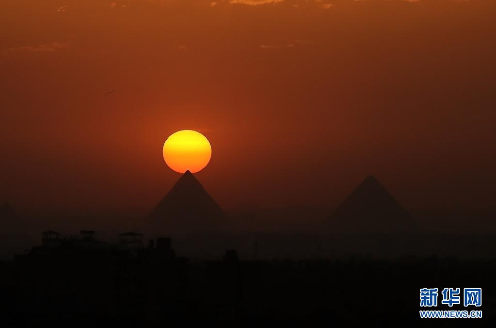 这是4月14日从埃及开罗拍摄的吉萨金字塔群日落景色。新华社记者 王东震 摄