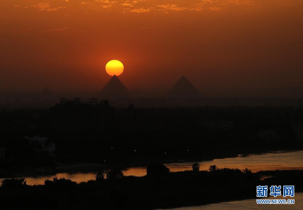 这是4月14日从埃及开罗拍摄的吉萨金字塔群日落景色。新华社记者 王东震 摄