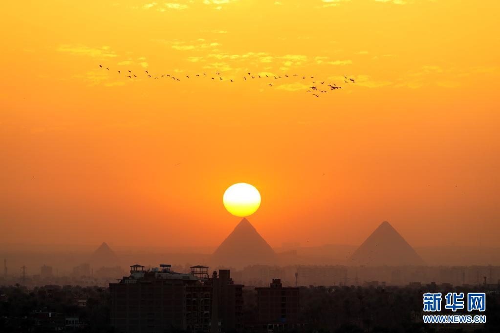 这是4月14日从埃及开罗拍摄的吉萨金字塔群日落景色。新华社记者 隋先凯 摄