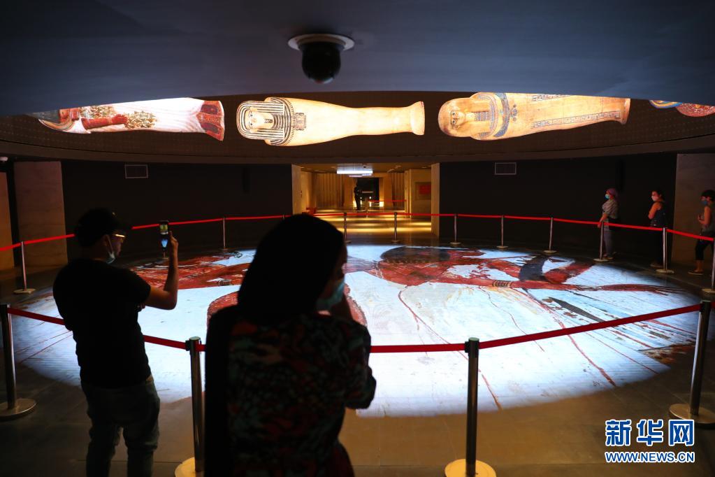4月18日,观众在位于埃及首都开罗的埃及文明博物馆王室木乃伊馆入口处拍照。