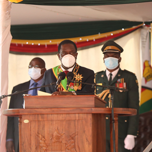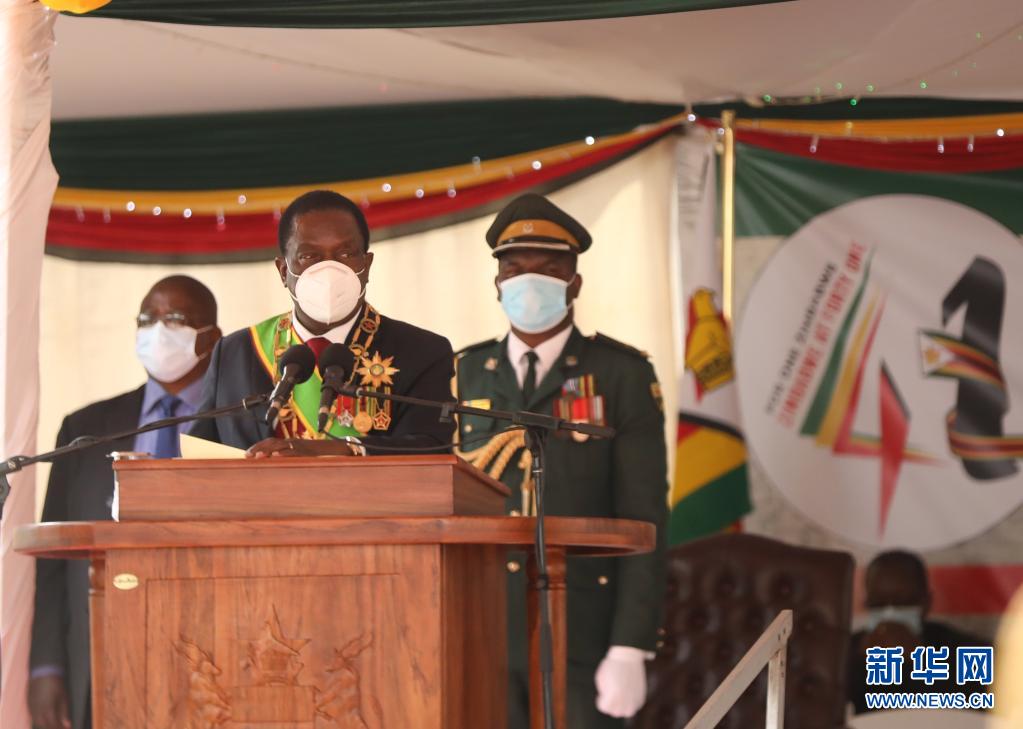 4月18日,在津巴布韦首都哈拉雷的总统府,津巴布韦总统姆南加古瓦(前)在津独立41周年庆祝仪式上讲话。