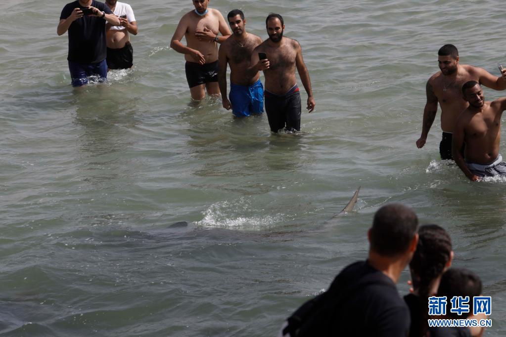 4月20日,在以色列北部城市哈代拉的海边,鲨鱼从人们身边游过。