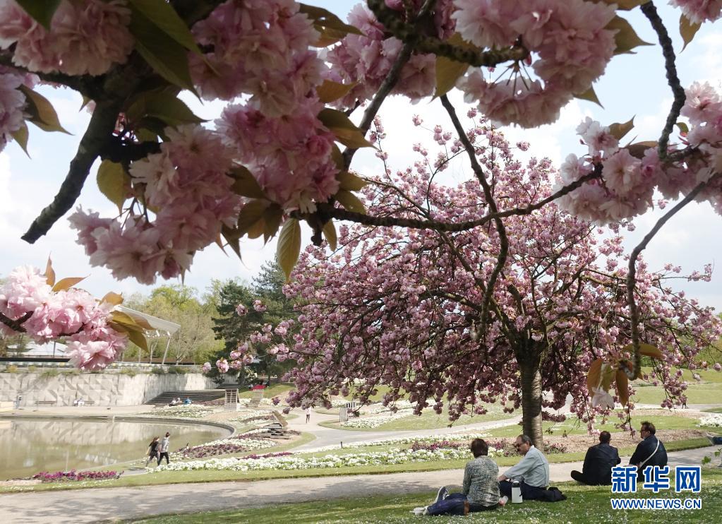 4月21日,人们在法国巴黎一处公园的樱花树下休闲。