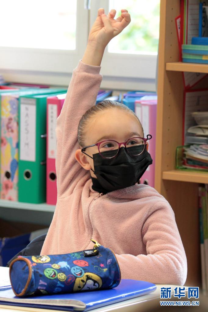 4月26日,在法国南部昂蒂布的一所小学,一名学生举手发言。