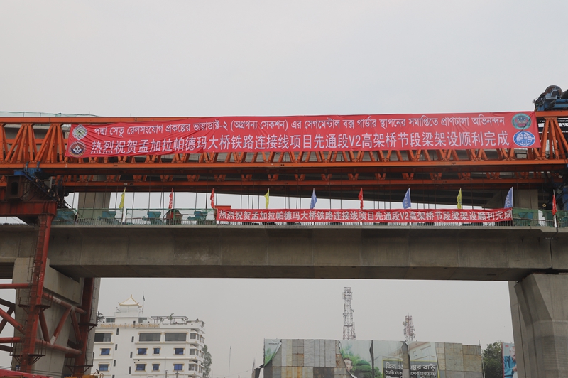新华网达卡5月8日电(记者刘春涛)在孟加拉国铁道部、军方监理以及当地40余名媒体记者的见证下,中国中铁帕德玛大桥铁路连接线项目V2高架桥最后一孔节段箱梁近日成功架设。活动现场,孟加拉国铁道部部长努如尔·伊斯拉姆·苏简亲手将孟方的感谢信交到中方项目经理王坤的手上。