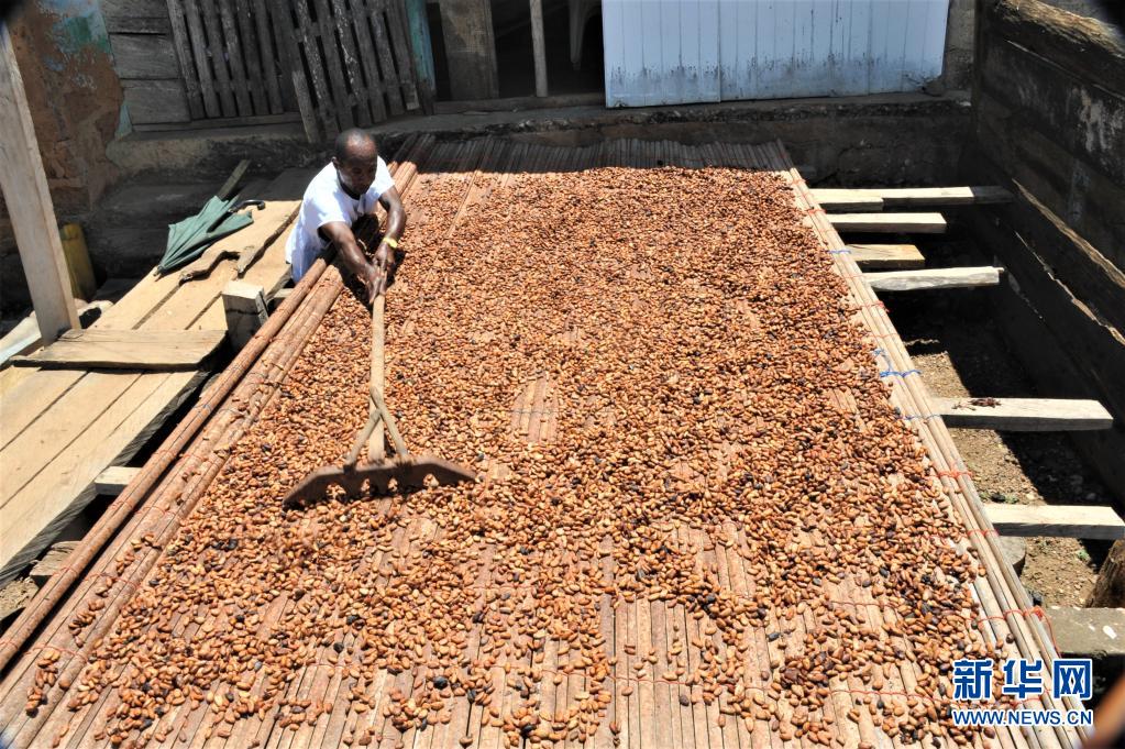 5月11日,在加纳东部省一处可可种植园,一名种植户晾晒可可豆。