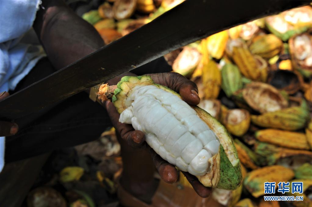 5月11日,在加纳东部省一处可可种植园,一名种植户在可可果实里面取出新鲜的可可豆。