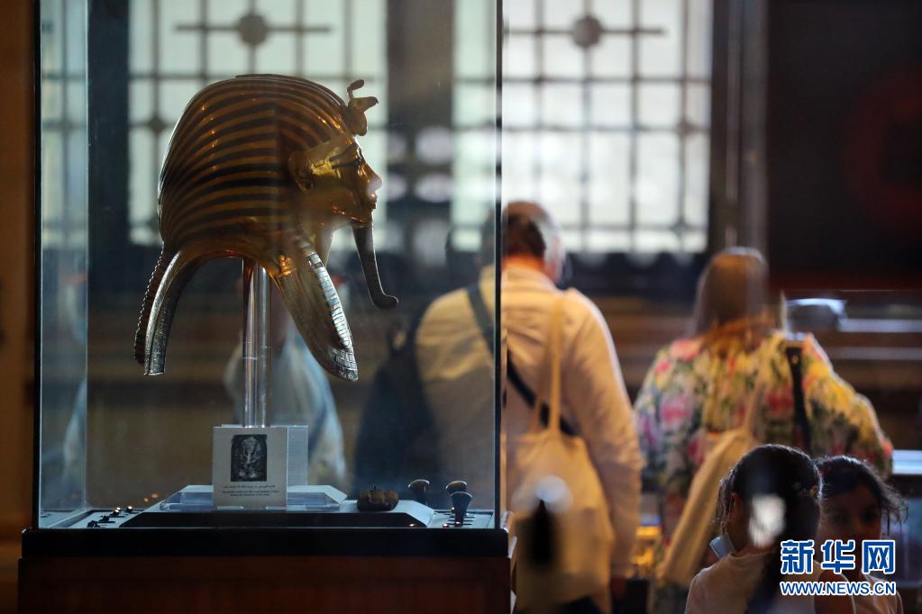 5月18日,游客在埃及开罗的埃及博物馆的图坦卡蒙黄金面具旁参观。