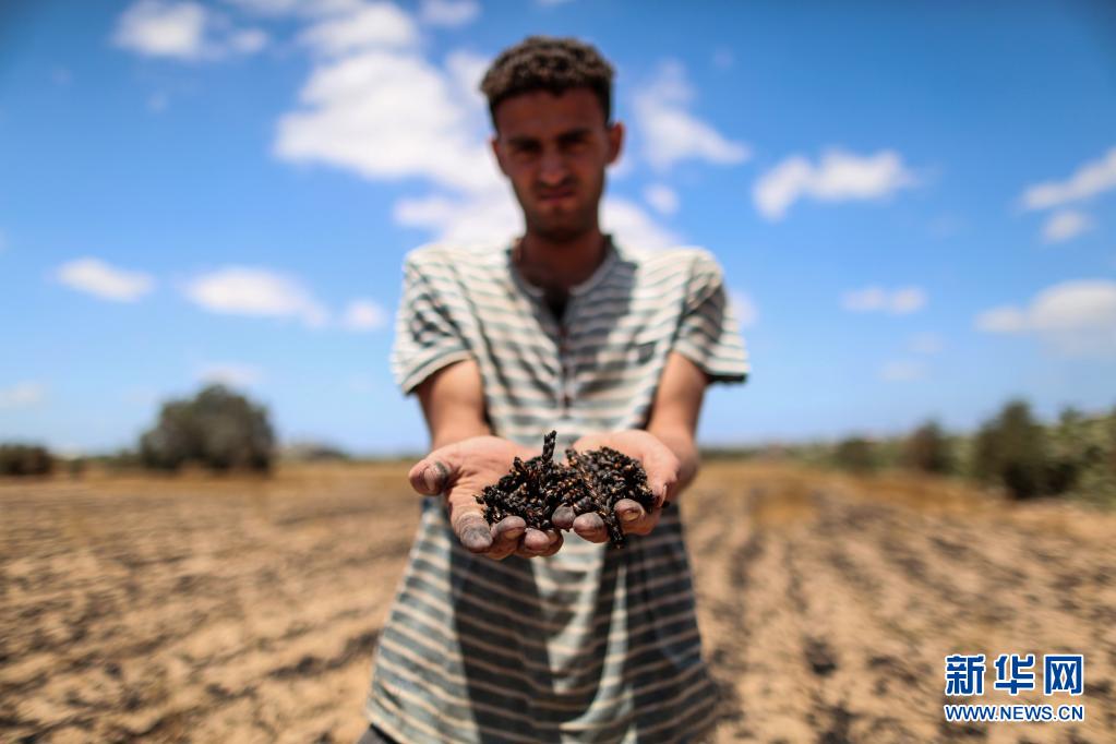 5月22日,在加沙地带汗尤尼斯,巴勒斯坦农民手捧被以色列炮击烧焦的麦子。新华社发(亚西尔摄)