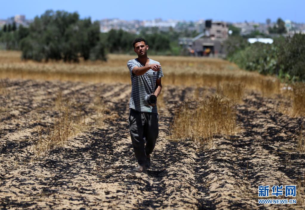 5月22日,在加沙地带汗尤尼斯,巴勒斯坦农民走在被以色列炮击烧焦的麦田间。新华社发(亚西尔摄)