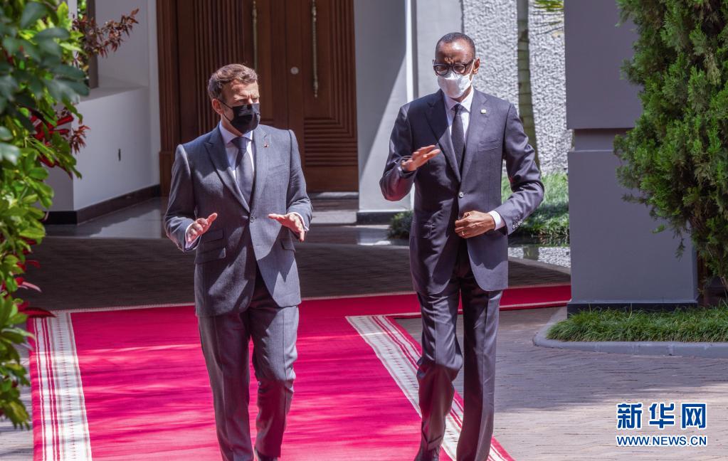 5月27日,卢旺达总统卡加梅(右)与到访的法国总统马克龙在卢旺达首都基加利交谈。