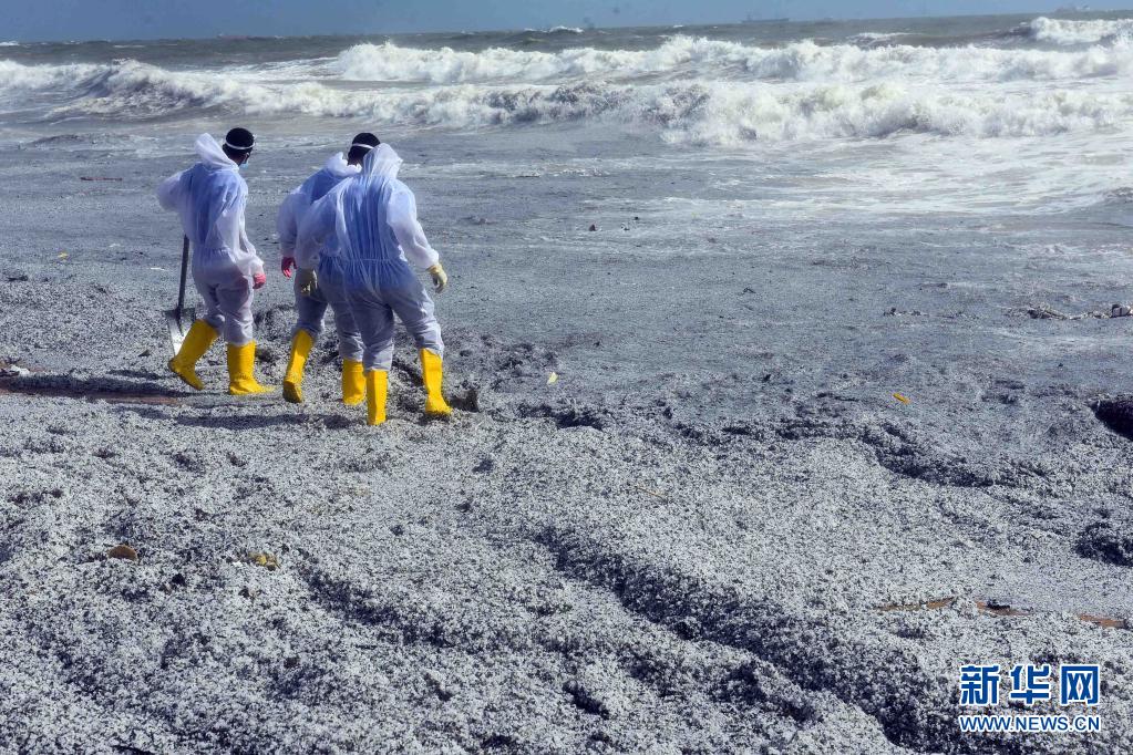 5月27日,安全人员在距离科伦坡30多公里的斯里兰卡西海岸城市尼甘布清理被海水冲到这里的集装箱船“X-PRESS PEARL”的碎片。
