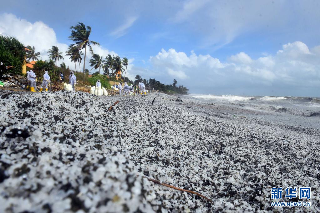 5月27日,安全人员在距离科伦坡30多公里的斯里兰卡西海岸城市尼甘布清理被海水冲到这里的集装箱船“X-PRESS PEARL”的碎片。