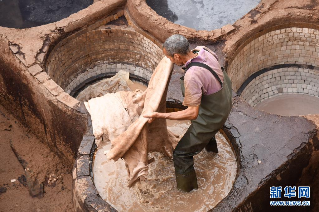 5月30日,工人正在摩洛哥非斯古城内的皮革染坊中劳作。