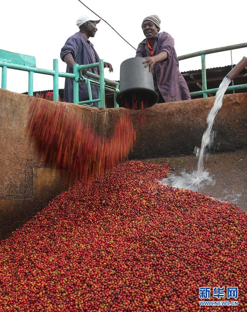 6月3日,在肯尼亚鲁伊鲁的一家咖啡园,工人将咖啡豆倒入清洗站。