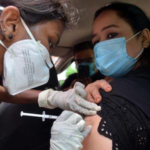 6月7日,一名医务人员在印度新德里为一名乘车女子接种新冠疫苗。