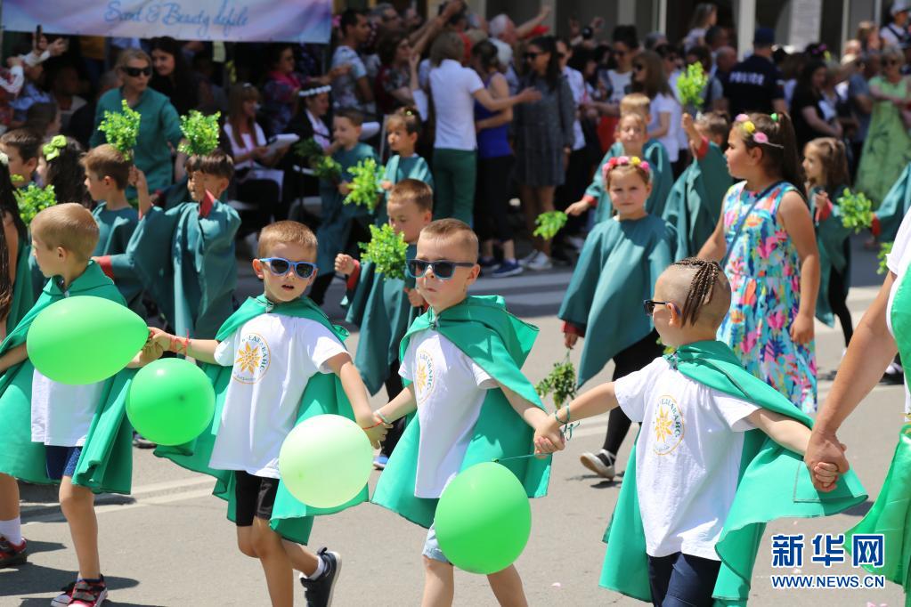 6月6日,在保加利亚卡赞勒克,小朋友参加玫瑰节游行。