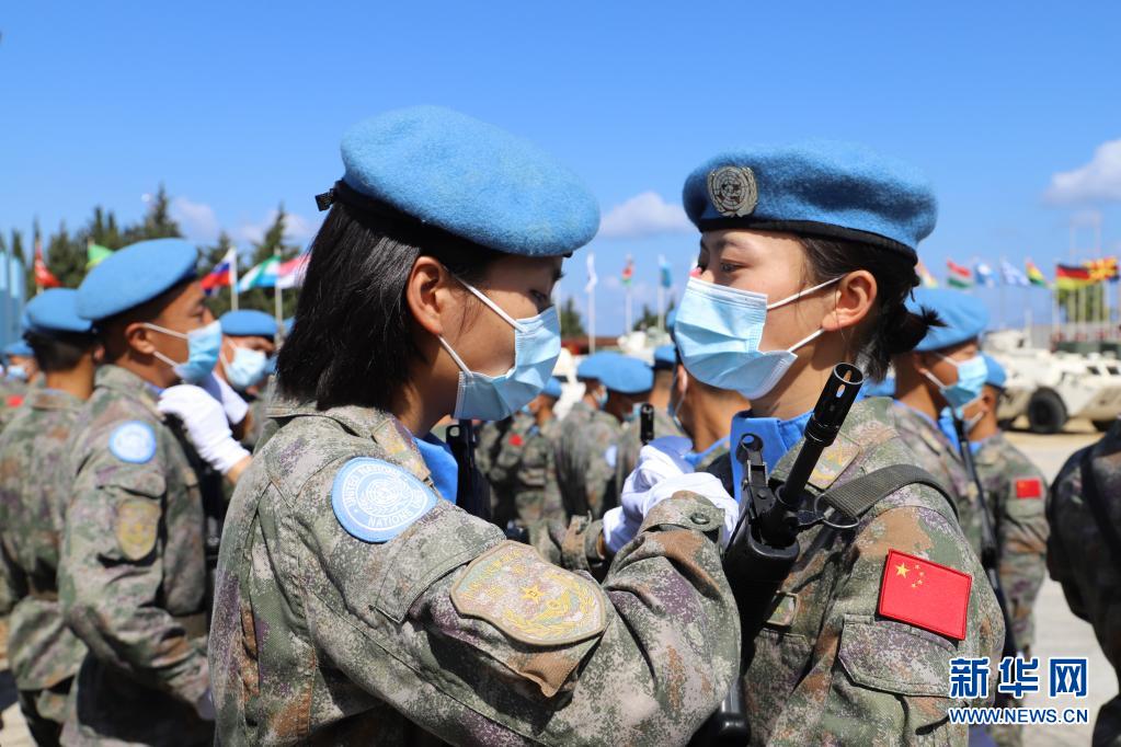6月16日,在黎巴嫩南部辛尼亚村中国维和营举行的授勋仪式上,接受检阅的维和女兵进场前互相整理着装。