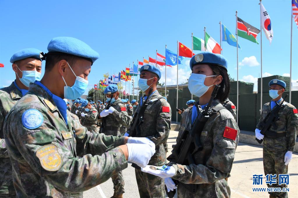 中国第19批赴黎巴嫩维和部队授勋仪式16日上午在黎巴嫩南部辛尼亚村的中国维和营举行,410名官兵全部被授予联合国和平勋章。新华社发(刘雄马摄)