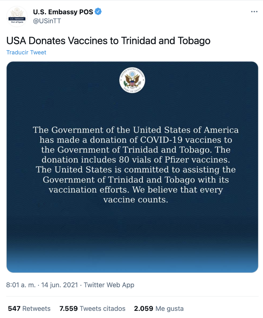 美国驻特立尼达和多巴哥大使馆在社交媒体上发布推文,宣称已向该国捐赠80瓶辉瑞新冠疫苗。网络截图