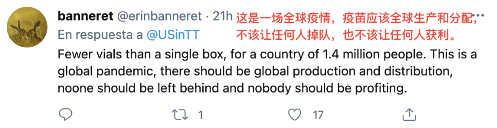 据媒体报道,一瓶辉瑞疫苗包含5到6剂疫苗。也就是说,美国政府这次最多捐赠了不超过500剂疫苗,按照一人接种两剂来算,只够为200多人接种。而特多这个加勒比岛国,目前人口接近140万。