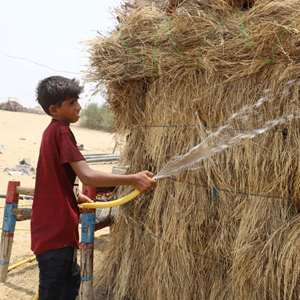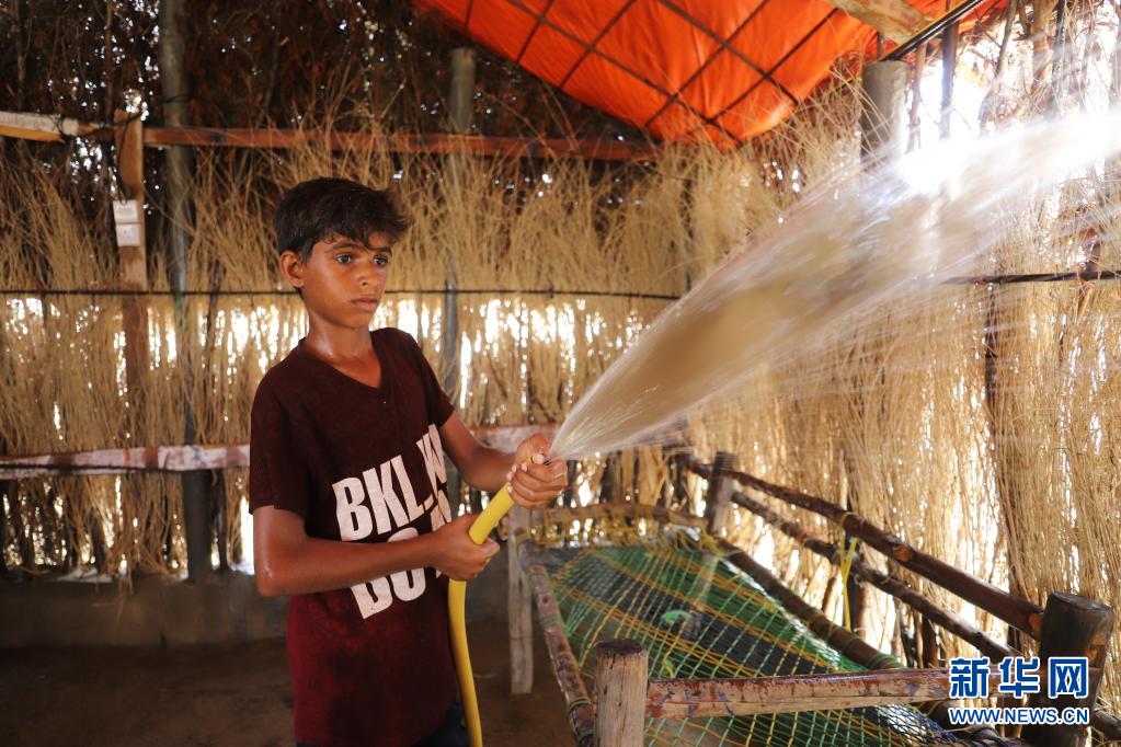 6月17日,一名男孩在也门北部哈杰省的一座难民营内给自家的茅草屋浇水降温。