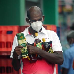 6月21日,一名男子抱着刚买到的物资走在斯里兰卡科伦坡街头。