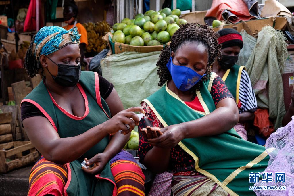 6月23日,商贩在乌干达坎帕拉的纳卡塞罗市场使用手部消毒液。