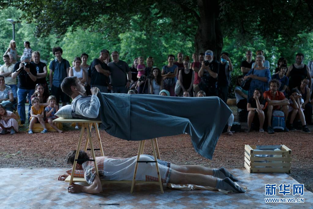 6月30日傍晚,艺术工作者在斯洛文尼亚首都卢布尔雅那进行街头戏剧节表演。